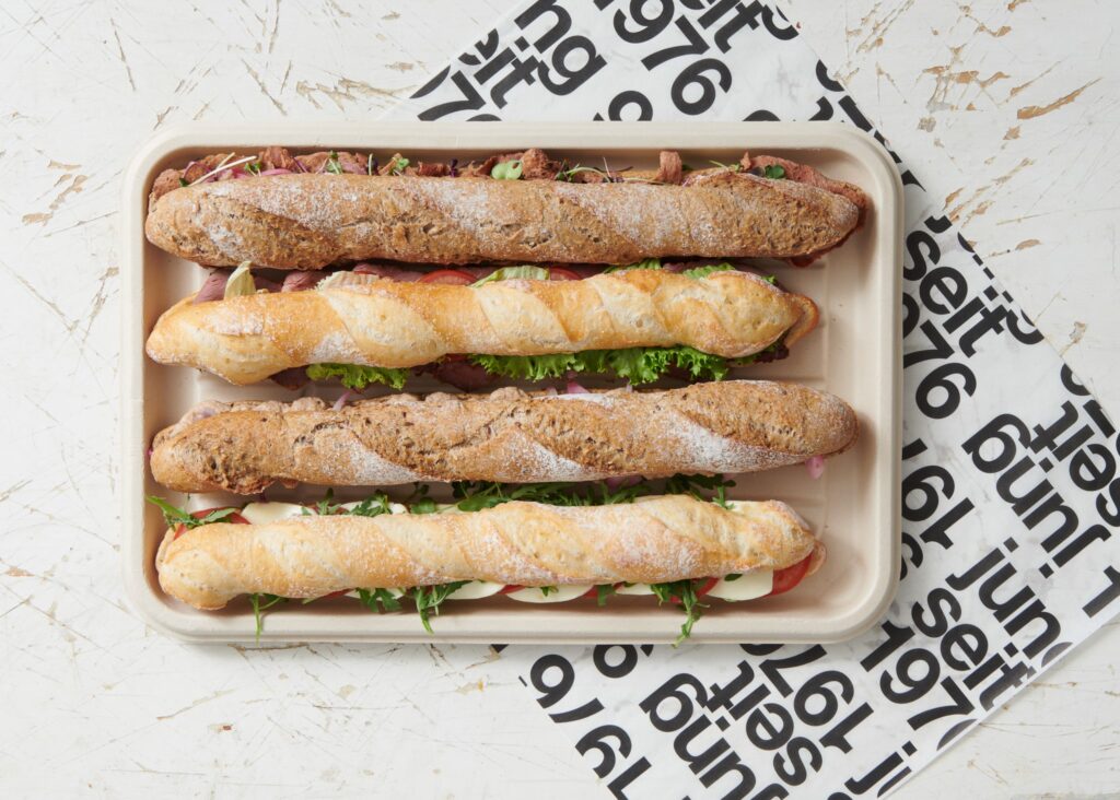 1 Dunkles Baguette mit planted Pastrami, Veganaise, gepickelte Zwiebeln und Microgreens